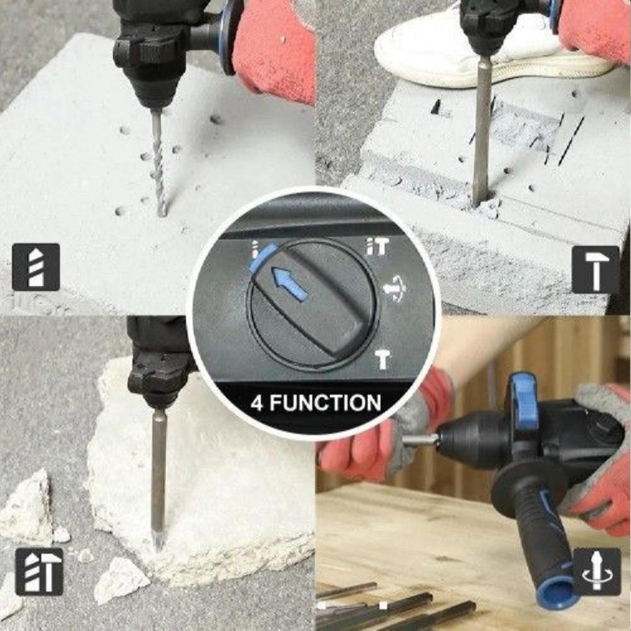 Комплект поставки1 x ограничитель глубины; 1 x Вспомогательная ручка; 1 наконечник долота 18 x 320 мм; 1 плоское долото 22 x 320 мм; 3 сверла (8/10/12 мм)