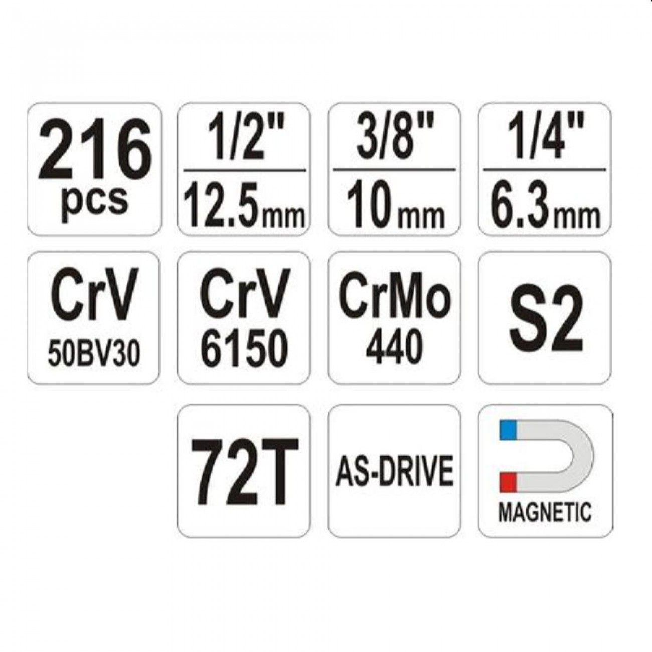 6,6,5,8 мм, PH3, PH4, PZ3, PZ4, T25, T27, T30, T35,2XT40, T45, T50; шестигранники 5,5,6,6,6,5,7,8 мм, M5, M6, M8, M10