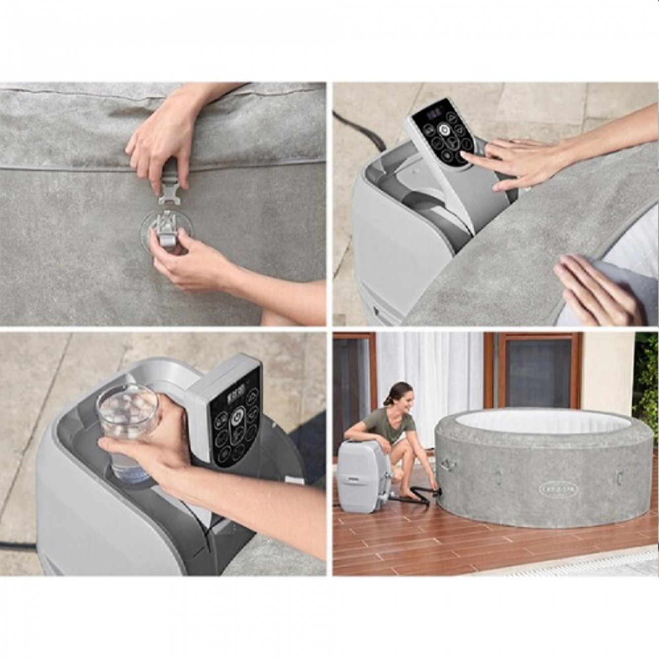 В комплект входит все необходимое для наслаждения вашим джакузи SPA: надувной бассейн SPA, защитный чехол, насос/электрический нагреватель с пультом управления, массажная система с воздушным компрессором, фильтрующий картридж, п